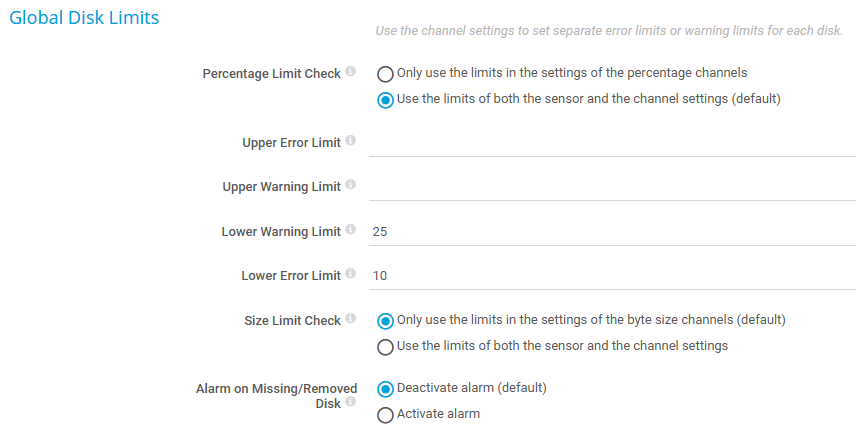 In this section, you can set limits for percentage channels and size channels. The limits that you define in these settings apply to all drives in the sensor. With limits, you can define when the sensor shows the Warning or Downstatus, depending on the data provided by all drives that this sensor monitors. If you want to individually define limits for separate channels, use the limit settings in the channel settings.